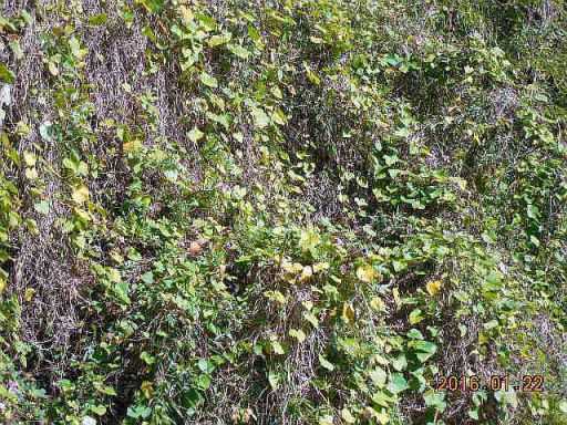4月中旬に、前記の丘陵に寄ってみたら、農道の脇の北側の斜面に、西洋朝顔の葉を付けたツルが広がってい、2016年1月25日の朝の、年に一度有るか無いかのような冷え込みで、西洋朝顔のツルの、ほとんどが枯れたので、地下茎から出たツルが生長したようであり、ツルの生長具合から推測すると、3月には、既に地下茎からツルが出て伸び始めたのでは。 |