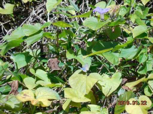 2016年1月25日の朝に、年に一度有るか無いかのような冷え込みが有り、早朝に、我が家の軒下の温度計がマイナス3度まで下がりました。 この日の朝の冷え込みで、前記の丘陵の農道の脇の北側の、斜面の草木を覆うように、上に向かって広がっていた西洋朝顔のツルが、ほとんど枯れてしまいましたが、シジミチョウの仲間に見える小さな蝶は未だいて、時々飛んで、止まる場所を移動していました。 |