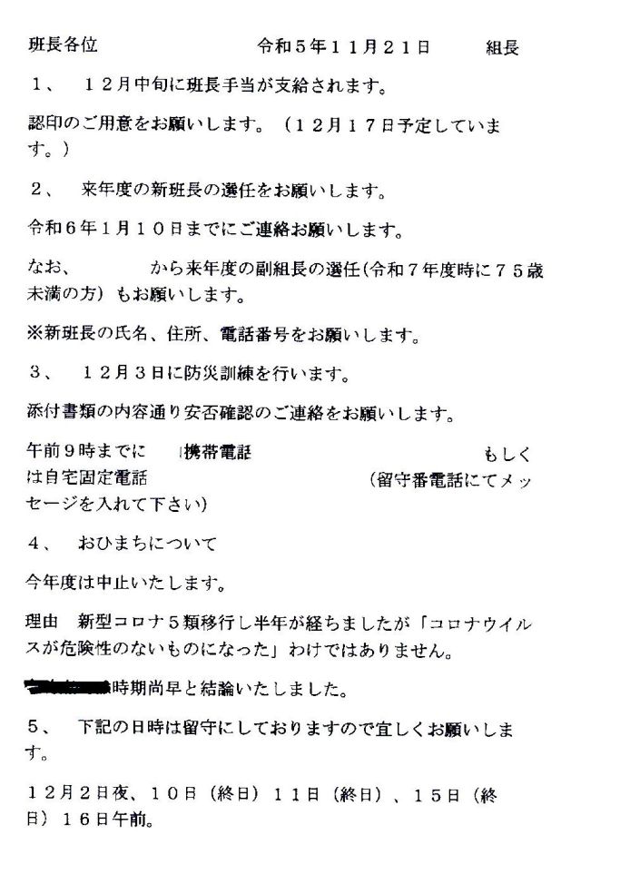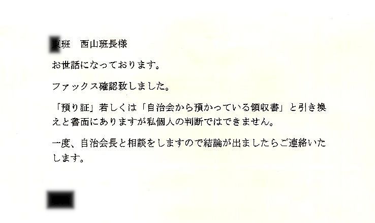 またもや、自治会関係のトラブルだらけです。 本年度(令和5年4月〜令和6年3月末)は、私が属している班の班長は順番通りに私が成りましたが、最初からトラブルだらけです。 令和5年4月16日の10時頃に自治会関係の徴収費用を「組長宅」に持参しました。 その内訳は、浜松市消防団・・・・・○○分団後援会費1,000円+緑の募金100円で、私の分も含めて全10世帯で合計11,000円。 私が属している班の「我が家以外の家庭」と「私の分」を含めて、自治会関係の徴収費用を「班長」の上の「組長」の自宅に持参して手渡し、その際に、私が「組長」に、「組長」から「私」への「受取証」を求めしましたが、 全家庭へ配る自治会からの領収証と「緑の募金のシール」を私(班長)に渡したから、領収証が二重に成るので、「組長」から私(班長)への「領収証」を渡す必要はな無い!!の一点張りで、「お話にならない」ので、近所の家に聴こえるように声を荒げて様々な事を言って早々、我が家に帰って来ました。 前回、十年ほど前に、私が属している班の「班長」を務めた時には、小学校の時の同級生の女性の家庭が組長(同級生の旦那/入婿?)の自宅に、私が属している班の「全家庭」と「私の分」を含めて、自治会関係の徴収費用を持参する度に、必ず、「組長代理?」の同級生の女性が「市販の領収証」に必要事項を記載した「領収証」を出しましたので、当然、自治会が組長に指示しているのでは? ![]() その組長が三月下旬に挨拶に来た時には、「仕事で帰りが遅くなるので、市の広報など回覧板で回す自治会関係の配布物を何処に置いたらいいですか?」と訊いたので、玄関の外の柱に取り付けてある郵便箱の下の回覧板入れ(奥行きは少ないが大きい郵便箱)に入れて下さいと答えました。 その際に、その組長が「午前中は、だいたい居ます。 来る前に電話して下さい」と言いました。 私の班の前任者からの「引き継ぎ物」の中に小さなメモの紙片が入っていて、自治会が各家庭に回覧板で配る配布物を、「組長」が「班長」に配る日は、毎月、7日と22日で、「社務所(近所の神社)に取りに行きます」と手書きで記載されていましたが、組長が三月下旬に挨拶に来た時に、「仕事で帰りが遅くなるので、市の広報など回覧板で回す自治会関係の配布物を何処に置いたらいいですか?」と訊いたので、前記のメモの紙片は無視して、初回の4月7日に、市の広報など回覧板で回す自治会関係の配布物を「社務所(近所の神社)に取りに行きませんでした」。 ![]() 4月8日の朝に、玄関の外の柱に取り付けてある郵便箱の下の回覧板入れに市の広報など回覧板で回す自治会関係の配布物が入れて有りましたので、前記の「引き継ぎ物」の中の小さなメモの紙片に記載されていた事は嘘だった事になりますので、「証拠」として保管して有ります。 (「現物」とスキャナーでパソコンに取り込んだ画像ファイルの二重に保存してあります) 初回の市の広報など回覧板で回す自治会関係の配布物が組長から届けられる数日前に、「4月の組長の在宅スケジュールの文書」と共に茶封筒に入れられて我が家の郵便ポストに入れられていた文書と、前記のメモ書きが、妙に符合するのは・・・・・ ![]() (「現物」とスキャナーでパソコンに取り込んだ画像ファイルの二重に保存してあります) なお、前記の「4月の組長の在宅スケジュールの文書」は、私だけに寄越した「文書」で、同じ組の残りの7班の班長には配っていない疑いを感じています。 果たして、同じ組の8班の班長8人全員に「4月の組長の在宅スケジュールの文書」を渡したのだろうか? (「現物」とスキャナーでパソコンに取り込んだ画像ファイルの二重に保存してあります) なぜか、「5月の組長の在宅スケジュールの文書」は未だに届いていません。 市の広報など回覧板で回す自治会関係の配布物に前記の、自治会からの領収証と「緑の募金のシール」が同封されていたので、早速、4月8日(土曜日)の午前8時半過ぎに、組長の自宅に自治会関係の徴収費用を持参したら夫人が応対して、「主人は、今日は出掛けていて明日の夕方にならないと帰って来ません」「あー、ー、ー、主人でないと全く分かりませ!!」と如何に面倒臭そうに、如何にも嫌そうに言われたので、私は早々退散しました。 なお、私の班では、班長の手間を軽減する目的で、4月下旬から5月頃に一年分の自治会関係の徴収金や様々な寄付金などを、各家庭から一括して集金して預かり、預かった金から自治会関係の徴収金や様々な寄付金などを支払う仕組みになっていて、例年、各家庭から一括して一万三千円ほど集金して、年度末に、残金がでれば返却する仕組みになっています。 自治会の年間の集金予定の書類を見ると、今年は一万四千二百円の予定ですが、何度、集金に出向いても留守で無駄足になるかも知れないので、わざわざ嫌な思いをさせられる事も無いので、当面、集金するのは止めておいて、自治会関係の徴収金や様々な寄付