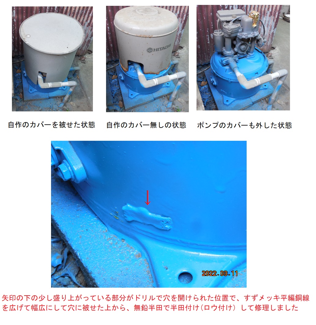 ![]() ![]() 浅井戸ポンプのタンクに、ドリルで直径5mm程の穴を開けて、その穴から入れられる毒物として、毒物に関して素人の私は、鉛の割合の多い鉛糸半田を思い浮かべますが、大量に入れれば、鉛中毒で体が不自由になったり、酷ければ死ぬかも知れません。 毒物に詳しい本件の犯罪者の爺は、ヒ素などの別の毒物をポンプのタンクに入れたかも知れません。 直径5mm程の穴から入れた細長い毒物は、浅井戸ポンプを外して、吸水口や吐出口、ドレーン口などから大量の水を流し込んでも排出できないので、飲用や台所用の水として一切使えません。 台所の水道では洗髪し難いので、日課にしている早朝の洗髪を台所の外に有る「流し台」の自家水道のホースの水でして、急いで台所の水道で顔を洗い直して、口も、すすいでいましたが、自家水道から台所の水道に移動する僅か二、三秒の間でも目に沁みるので、同じ「流し台」にある市の水道のホースの水で洗髪するようにしました。 自家水道の水は年間を通して水温がほぼ一定ですが、市の上水道の水は気温に大きく左右され、冬は手が痛いぐらいに冷たく、夏は生ぬるく、今の時期は自家水道の水より少し冷たいですが仕方ないです。 ![]() なお、水質検査をすれば、浅井戸ポンプのタンクの中に、どんな毒物が入れられている容易に分かります。 2022/02/15日頃に、我が家の自家水道の浅井戸ポンプのタンクの底部の側面の地面が水で濡れている事に気付きました。 最初は、気温の変化や水温の変化による浅井戸ポンプ本体の結露で、タンクの底部の側面の地面が水で濡れているのかもと思いましたが、日増しに、タンクの底部の側面の地面の水濡れが酷くなってきました。 浅井戸ポンプのタンクの底部の側面の地面の水濡れが酷くなる一方なので、水濡れの原因と思われる個所の、タンクの底部の側面の溶接部分を乾いた布で拭いて綺麗にしてみたら、その個所から、少しづつ水が滲み出ていて、ポンプのタンクから水が漏れている事が判明しました。 少しづつ水が滲み出ていている個所を目を凝らして見ると、溶接部分の少し上から少しづつ水が滲み出ているようにも見えましたが、その個所に傷や穴は全く確認できませんでした。 ポンプのタンクから水が漏れているのが確実なので、金属パテで修理しようと思って、 2022/02/25日に、大手のネット通販サイトで金属パテ(コニシの金属パテ1本)を購入しました。 確かに、在庫有り、即日発送と表示されていたので、翌日の朝、その大手のネット通販サイトからの商品発送メールを確認したら、商品発送メールが見当たらなかったので、本件の犯罪者の爺に買収されている、その大手のネット通販サイトの商品発送部門の関係者が、毎度の事で、爺に指示されて故意に商品を発送しないのだと思いましたが、念の為に一日待って、翌日、再度、商品発送メールを確認したら、商品発送メールが見当たらなかったので、その大手のネット通販サイトの会員ページにログインして、注文履歴の詳細を確認したら、配達会社が、いつもの会社ではなく、ヤマト運輸で、荷物の現在位置が事業所向けの中継基地になっていたので、その商品は放棄して、 直ちに(2022/02/27日)、別の準大手のネット通販サイトで金属パテ(コニシの金属パテ2本)を購入し、更に、念の為、楽天モールに出店している通販会社で、発送の翌日に商品が届く上に送料の安いメール便で送れる同様の商品(粘土パテとマフラーパテ)を別々の通販会社で購入しました。 これだけ買えば、本件の犯罪者の爺に買収されない真ともなネット通販サイトが一つぐらい有るだろうと思いました。 ![]() 2022/02/27日に、浅井戸ポンプの水漏れ修理について記載しているホームページを閲覧して、金属パテで浅井戸ポンプのタンクの穴の水漏れを修理をしても、わずか数時間で、また水漏れしたので、半田付けで修理したとの記載や、 大手のサイトの質問のコーナーに、「質問-浅井戸ポンプのタンクの穴の水漏れを半田付けで修理できますか? 回答-半田付けで充分修理できます」の記載を見て、上の金属パテなどは無駄になりますが、浅井戸ポンプのタンクの穴の水漏れ個所を半田付けで修理する事にしました。 2022/02/28日に、更に、半田付けより強度のある「ロウ付け」に関するホームページや動画サイトを閲覧していて、ロウ付けに関する動画の中に、「オートバイの燃料タンクの穴をロウ付けの要領で半田付けして塞いだ動画」が有り、その動画を見て、浅井戸ポンプのタンクの水漏れを、ロウ付けの要領でカセットガストーチを使って、半田付けで修理する事にしました。 (浅井戸ポンプのタンクの鋼鉄は厚さが有る上に大きくて、熱の放散が激しくて、300Wや500Wの大型の半田ゴテでも上手く半田付けできるか疑問なので、熱出力が2KW以上もあるカセットガストーチを使うことにしました) なお、「ロウ付け」と「半田付け」の違いは、母材と接合する「ロウ材」の溶け出す温度(固
