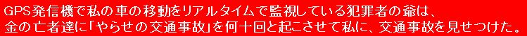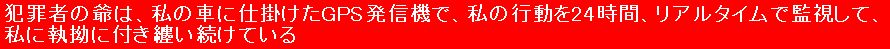 犯罪者の爺は私の車にGPS発信機を仕掛けていて、24時間・リアルタイムで私の車の位置を監視していて、私の行き先を予想して、先回りして、私の行く先の店舗の買収済み、あるいは、その場で買収した店員に携帯電話で指図して、その店員に、私に様々な事をし続けています。左の画像の機器は「盗聴妨害器」で妨害電波を発信して、GPS発信機の通信を妨害するのに使っていましたが、GPS発信機の近くに設置しないと効果が無く、また、現在仕掛けられているGPS発信機には周波数の関係か全く効果が無いので使っていません。 現在使っている車の新車納車時に、犯罪者の爺に買収された人間に、既に、故意に不具合を生じさせられていて、販売店に連絡して車を預けた際に、まず一台目のGPS発信機を仕掛けられ、そのGPS発信機を利用して私の車の移動をリアルタイムで監視して、金で釣った自治会・・・の名刺を示した爺に、私の車を故意に交通事故に巻き込ませました。 過失割合は私が1で、相手が9で決着しましたが、単なる交通事故ではなく、爺が金で釣った自治会・・・の名刺を示した爺に、私の車を故意に交通事故に巻き込ませた「片やらせの交通事故」でした。 交通事故の賠償交渉の際に、過失割合が、私が1で、相手が9で有るにも関わらず、相手方の任意保険会社の責任者を爺が金で釣って、私に対して故意に民事訴訟を起こしましたが、簡易裁判所で、私が一切争いませんでしたので数分で終わりました。 その任意保険会社が手配した自動車板金修理工場に車を預けた際に、二台目のGPS発信機を仕掛けられました。 それらの一連の行為で、犯罪者の爺は、買収に金が要る、買収に金が要ると様々な口実を言って、『k社』の社長の妾の息子に、『k社』から一千万円、二千万円の金を盗み出させたのでは。 上記の犯行で、犯罪者の爺は相当味を占めたのでは。 上記の二台のGPS発信機は、車のヒューズボックスからオーディオの配線のヒューズと、ルームランプの配線のヒューズを抜いて動作しなくしましが、 カー用品店でタイヤを買った際に、タイヤの交換作業を待っている間に、また新たなGPS発信機を仕掛けられ、そのGPS発信機で24時間・リアルタイムで私の車の位置を監視して、犯罪者の爺は執拗なまでの付き纏いを続けています。 なお、犯罪者の爺は、上記と同様の手口で、『k社』の社長の妾の息子に、『k社』から一億円、二億円の金を盗み出させています。 過去に書留郵便で、総理大臣や野党に出した手紙に記載して有る事ですので、下記の人間の屑の□□二人についても徹底的に捜査済みで、犯罪者の爺と同時に他の共犯達も同時に一斉逮捕されるのでは。 犯罪者の爺は私の母を毒殺した際に、人間の屑の□□二人を協力させて、□□を買収するのに金が要るとの口実で『k社』の社長の妾の息子に、『k社』から一億円、二億円の金を盗み出させました。 上記の犯行で、犯罪者の爺は更に味を占めたのでは。 前記のような犯罪者の爺が、『k社』の社長の妾の息子に、『k社』から大金を盗み出させた手口の集大成が、「警察に捕まったら死刑になる」と『k社』の社長の妾の息子を脅して・・・・・・・・・・・・では。 上記の人間の屑の□□二人は、『k社』の社長の妾の息子が刑務所から出所して来て証言したら「終わり」では。 もし政治の情勢が変わって、本件の犯罪者の爺が警察に逮捕される事態になれば、当然、上記の人間の屑の□□二人も、母に対する「殺人」の共犯として刑事裁判に掛けられて、死刑、または、無期懲役、もしくは、執行猶予無しの刑期の長い有期懲役で刑務所行きになるのでは。 強盗殺人や身代金目当ての誘拐殺人、保険金殺人など、「金目当ての殺人には死刑判決が多く、上記の人間の屑の□□二人も、『k社』の社長の妾の息子の証言や、犯罪者の爺の供述次第で、死刑判決の可能性が大いに有り得るのでは。 ![]() 犯罪者の爺は私の車に仕掛けたGPS発信機を使って、連日のように、金の亡者達の車を何台も動員して、 私の車の通行を妨害したり、車のナンバーの数字や車種、車の色などを犯罪者の爺のメッセージにした車を何台も動員して、私の車に執拗なまでに付き纏ったりし続けています。 私が早朝散歩に行く国道一号線の南に広がる畑作地帯に行くまでの幾つかの経路を予想し、私の車のGPS発信機の電波で、パソコンの画面の地図上の私の車の位置をリアルタイムで監視しながら、リアルタイムで携帯電話で「金の亡者達の車」に指図して、擦れ違えない道幅の狭い道路で鉢合せさせたり、私の車の通行を妨害したり、私の車の後を付いて来させたりしてい、その常軌を逸した執拗なまでの付き纏いに辟易しています。 私は道路をバックで、前進と同じ感覚で幾らでも走行できますので、たいがい、私が擦れ違いが出来る道幅が広い所まで後退して道を譲っていますが、その無駄な事の繰り返しに辟易しています。 早朝散歩の行きと帰りの両方で、それぞれ「金の