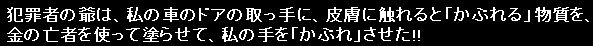 私が早朝散歩に行く前に自宅で、「▼◆■さんより、もっとスピード処刑で処刑して下さいよ」と「独り言」を言ってから、いつも通りに、国道一号線の南に広がる畑作地帯の農道に車を駐車して、畑作地帯を一時間ほど散歩して自宅に帰って来て、手にゴム手袋を嵌めてパソコン作業をしていたら、右手の甲の側が痒くなってきて、左手の甲の側も痒くなってきました。状況を振り返ってみて、私が農道に車を駐車して散歩している間に、朝の「・・・スピード処刑で処刑して下さいよ」の私の「独り言」に興奮した犯罪者の爺が、金の亡者に指示して、私の車の右側のドアの取っ手に、皮膚に触れると「かぶれる」物質を塗らせ、それが私の右手に付着して、それが、右手で触った物や部分にも付着して、それが左手にも付着して両手が「かぶれた」と判断しました。 私の車の右側のドアの取っ手に直接手を触れずにドアを開ける方法を色々考えた結果、最も安上がりな方法は、A4のコピー紙を四つ切にして、その一枚を二回、二つ折りにして、二枚重ねの、その小片でドアの取っ手の内と外を挟んで手の指で摘まんでドアを開く方法で、現在も、散歩に行く際に着ていくイベントブルゾンのポケットと、車のダッシュボードのポケットに紙の小片を沢山入れて、この方法でドアを開けています。 我が家に大量に残して有る、「印刷し損なった紙」を使っているのでコストはゼロです。