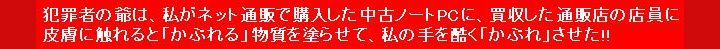 犯罪者の爺は、私がネット通販で購入した中古ノートPCに、買収した通販店の店員に皮膚に触れると「かぶれる」物質を塗らせて、私の手を酷く「かぶれ」させました。購入した店舗は、全国に実店舗を展開していてパソコンに限らず、様々な商品の買取・販売をしている会社の関東地方の▲▼◆■店(実店舗)で、過去に、この会社の様々な地方の実店舗からネット通販で、3台の中古パソコンを購入し、全て正常に動作し、取引も円滑に行わたので、この会社を信用して、2022年11月頃に、関東地方の▲▼◆■店(実店舗)からネット通販で購入しましたが、商品が届いて、届いた中古ノートPCを使い始めたら、翌日には手の甲が酷く「かぶれて」手が痒くなりました。 一晩ブランクが有るのは、前日は介護などに使うゴム手袋を手に嵌めてパソコンを操作していて、そのゴム手袋に付着した「皮膚に触れると『かぶれる』物質」が、手で触った様々な物に再付着して、更には使い回していたゴム手袋の裏側にも再付着してと、様々な経過を経て手の甲に付着して、手の甲が酷く「かぶれ」て手が痒くなりました。 なお、「かぶれ」るのは、皮膚の薄い甲の側だけで、手の皮膚の厚い手の平の側は全く「かぶれ」ませんでした。 それ以前の過去に、犯罪者の爺は、私がネット通販で購入した様々な商品に、買収した通販店の社員に皮膚に触れると「かぶれ」る物質を塗らせて、私の手を何度も「かぶれ」させていて、かぶれの原因が購入した中古ノートPCに有るのは明白でしたので、洗面器に入れた水に濃い目に台所用の中性洗剤を混ぜて、その液をタオルに浸み込ませて、ノートPCを始め手で触った物や部分を、何度も、繰り返し拭いてから、最後に水拭きしたら手の「かぶれ」は治まりました。