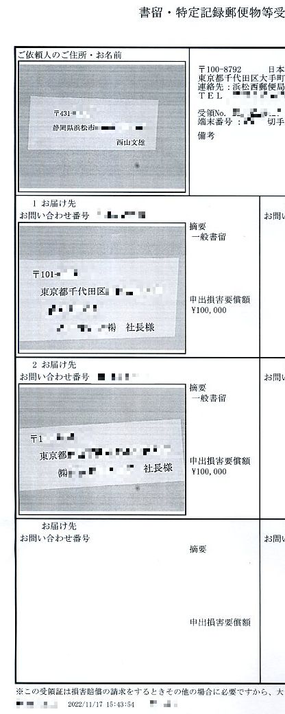 本件の犯罪者の爺の金欲しさに、本件の犯罪者の爺の手先になって、組長になるのを拒否している私に、金欲しさに、あの手この手で、嘘八百を並べて、執拗に、私に組長になるように迫り続けるのであれば、上記の内容証明郵便での「警告書」の手紙のコピーを添えて、再度、浜松市市長と浜松市自治会連合会会長と、西区自治会連合会会長に書留で手紙を出します。 更には、国政のトップの方々に手紙を出させて頂いた時と同様に、金の為なら何でもする金の亡者の首領挌の男に関りのある幾つもの組織や団体の最高責任者に、上記の内容証明郵便での「警告書」の手紙のコピーを添えて、簡単な手紙の本文に加えて様々な証拠書類や、国政のトップの方々に手紙を出させて頂いた最後の手紙の全文面を添えた手紙を書留郵便で出させて頂きます。 |