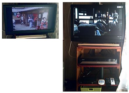 母が転倒しても危険の無い安全なテレビ台は、初めから角に丸味を持たせてある角材を組み合わせて組み立てて、テレビの上下左右前後全てを角材で囲んであるので、母がどんな姿勢や格好になって転倒しても絶対にテレビに頭をぶつける危険は有りません。 横長のソファーに座って母と並んでテレビ観ていて、アスペクト比が「16対9」の26インチのテレビだと小さ過ぎて観難いので、暫くして、32インチのテレビをネット通販で買ってテレビを入れ替えました。 26インチのテレビの方は、今まで座敷の南側の廊下のような長い部屋で母がテレビを観るのに使っていた22インチの「地デジチューナー内蔵のパソコンディスプレイ」と入れ替えました。