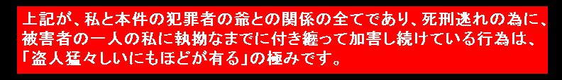 人々の想像を超える様な、犯罪者の爺による私への、常軌を逸した執拗なまでの付き纏いの原因は、犯罪者の爺が「死ぬほど恐れている死刑」を逃れたい一心で、「私を消せば死刑を逃れられる!!」、「私を何とかすれば死刑を逃れられる!!」、「私の信用を失墜させれば、私への応援者が居なくなって死刑を逃れられる!!」と言うような「死刑逃れ」が全てです。