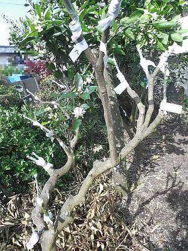 この「宮川早生」という温州ミカンの木の枝に、「ハッサク」の穂木を20ヶ所ぐらい「高接ぎ」しました。 |