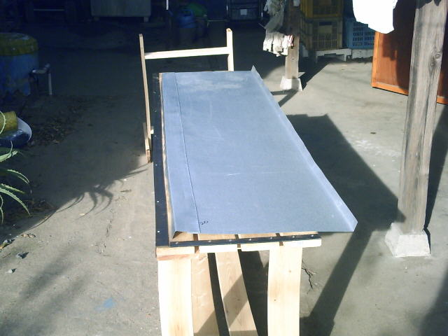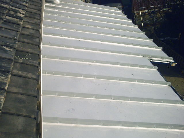 2011年に当地を直撃した台風の為に、我が家の別棟(物置?)のトタン波板一枚と、車庫として使っている農作業小屋のビニール波板二枚が剥がれたので、修理する為にインターネットで資材を探したら、「ガルバリウム波板」という、ペンキ塗り不要でメンテナスフリー、トタン板の3倍から6倍の耐久性がある資材が有る事が分かり、9尺(長さ:約2700mm)のガルバリウム波板をネット通販で10枚購入して、前記の破損箇所を直しました。 余ったガルバリウム波板を、我が家の別棟(物置?)のトタン板の上に重ねて葺いてみたら、思いのほか簡単に葺け、この方法であれば、雨漏りの心配が無く、母の面倒を看ながら、少しずつ葺けるので、我が家の別棟(物置?)と母屋の「瓦棒葺き」の屋根の部分を、ガルバリウム波板やガルバリウム鋼板(平板)で葺く事にしました。 今年の夏に、母を車に乗せて避暑かたがた、アブラゼミ、ヒグラシ、ツクツクボウシ、ニイニイゼミ、ミンミンゼミなど、さまざまなセミの鳴き声(1、2)が聴ける標高の高い林道にドライブに何度も行き、急勾配の上り坂や下り坂の連続有り、急カーブの連続有り、山有り、谷有り、川有り、湖有りの長時間の変化に富んだドライブで母の頭の調子が良くなったのか、我が家に帰って来ると、その度に我が家の錆びたトタン屋根を見て、「屋根をやって(ペンキ塗り)もらわにゃいかん」「どっかに屋根をやって(ペンキ塗り)もらわにゃいかん」と言いましたので、ペンキ塗り不要でメンテナスフリー、トタン板の3倍から6倍の耐久性があるガルバリウムで葺き替える事に意欲が湧きました。 ![]() 手始めに、我が家の別棟(物置?)の屋根を葺くことにしましたが、屋根の面積が相当に広いので、相当な日数と時間が必要ではと思いましたが、午前と午後の合わせて1日に3時間から4時間作業をして、4日で葺き替えを完了しました。 写真の手前の斜めに切ったガルバリウム波板を貼るのに、ガルバリウム波板を波板用のトタン鋏で斜めに切るのに、波に沿って切るのであれば波板と鋏の刃の山と谷のピッチが合って切り易いのですが、斜めだと波板と鋏の刃の山と谷のピッチが合わず、非常に切り難く時間を要し、切断面も凸凹になりましたが、切断した部分が「棟包み」に隠れるので問題ありませんでした。 もし、壁面や屋根の端に貼る為に、波板を斜めに綺麗に切断する必要があれば、グラインダーか波板用の丸鋸刃を使った方が良いと思いました。 その後、ディスクグラインダーを購入して、厚さ1mmのディスク(円盤状の砥石)でガルバリウム波板を切断したら、火花が沢山飛び散りますが、スッパ、スッパと簡単に切れたので、最初からディスクグラインダーで切ればよかったと思いました。 ガルバリウム波板をオールステンレスのスクリュー笠釘を打ち込んで、屋根に貼っていくのは簡単で、それほど時間を要しませんでした。 なお、釘に螺旋の溝が刻まれたスクリュー釘は、旧来の釘に比べて締結力が相当強く、釘を打っていて途中で曲がって、その釘をバールで抜こうとしても、抜くのに苦労するほど締結力が強いので、「棟包み」を取り付ける為の杉板を屋根に取り付ける特別長い釘以外は、全てステンレス製のスクリュー釘を使いました。 ![]() 屋根の頂に取り付ける「棟包み」を取り付ける杉板に適合する寸法(幅:約97mm 厚さ:約15mm)の杉板が、ホームセンターの資材館になかったので、幅180mm×厚さ15mm×長さ4000mmの杉板を、そのままでは長過ぎて車に積めないので半分に切って頂き、それを持ち帰って、丸鋸に一定の幅に切る為のガイドを付けて、板の長さ方向に切りましたが、1本2メートルの杉板を、屋根の棟の長さの二倍分切らなければならず、相当な時間と労力を要しました。 杉板が屋根の棟の長さの二倍分必要な訳は、屋根の棟に、二枚の杉板をハの字の山形に取り付けるからで、材木には節などの固い部分と柔らかい部分があり、丸鋸の刃が硬い部分に来ると、杉板から大量の煙が出て、なかなか切り進めず、相当な時間と労力を要しました。 材木は水に濡れなければ腐らないので、完璧を期して、屋根の「棟包み」の下の波板の谷の部分には、全て、シリコンシーラントを充填して、屋根で跳ね返った雨の飛末が内部の杉板にかからないようにし、その為に、シリコンシーラントをダンボール箱2箱48本+ばら売りを10本ほど購入しました。 また、笠の無い釘の全てにシリコンシーラントを塗って、雨水の一滴も浸み込まないようにしました。 ![]() 我が家の別棟(物置?)の屋根の葺き替えが完了したので、次に、母屋の南側の「瓦棒葺き」の屋根の部分を葺き替えることにしました。 この屋根は、「瓦棒」という角材と角材の間に、金属板製の幅広で浅いコの字形の雨樋のような構造の部品を嵌め、「瓦棒」の部分にコの字形の蓋を嵌め、その側面に釘を打って固定する屋根の葺き方です。 幅広で浅いコの字形の雨樋のような構造の部分は、自分で制作し、「瓦棒」の部分